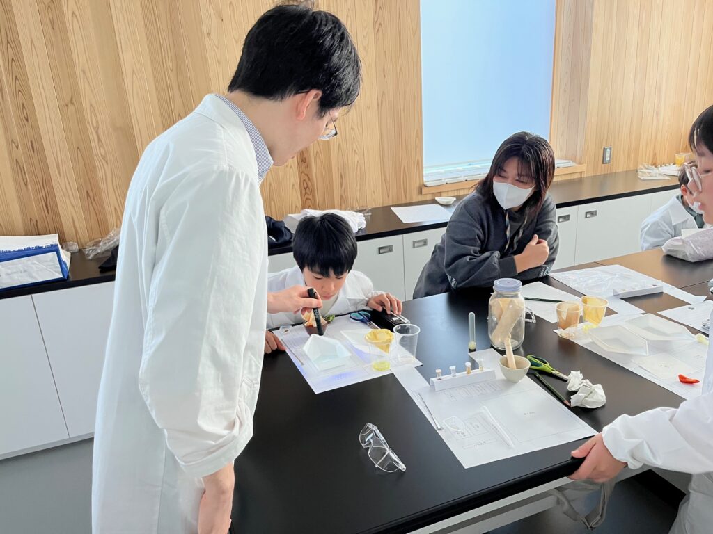 プログラムは午前午後1回ずつ、各1時間半ほどで、合わせて24組の子供と保護者の方々にご参加いただきました。子供たちは初めて触る器具に興味を持つと同時に、身近なものでもできる実験に驚きと感動を得ていたようでした。実験後にはたくさんの質問をいただきました。 また、高知国際高校の高校生4名にも、子供たちの作業を手伝っていただき、充実したプログラムを実施することができました。