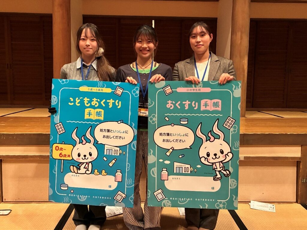 別府市薬剤師会の皆様と学生が連携し、「こどもおくすり手帳」の作成に取り組み、このたび完成いたしました。作成には、本学から1年生4名が参加しました。なお、本取り組みには、本学卒業生であり、現在別府市薬剤師会でご活躍されている野中先生にもご尽力いただきました。